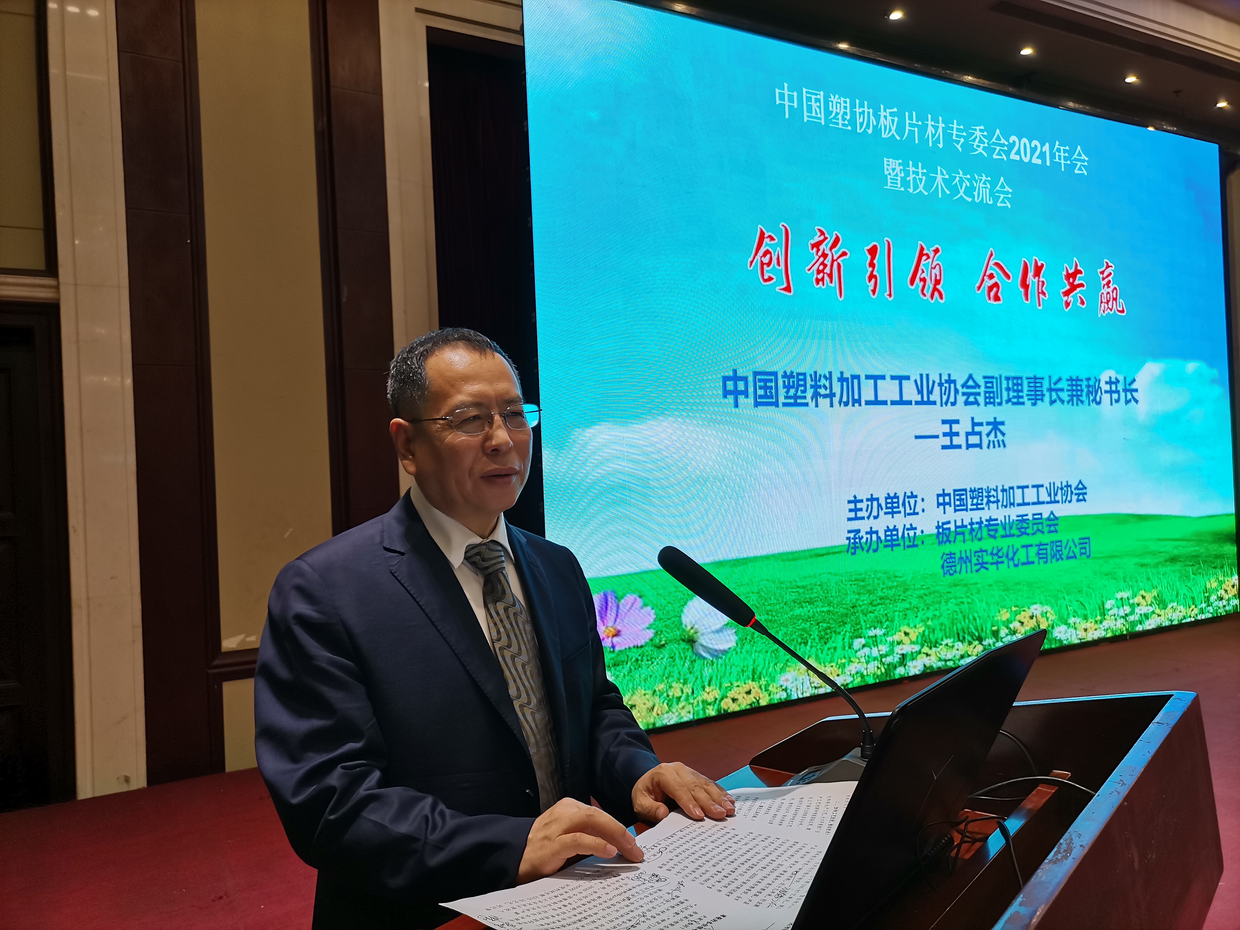 6月10日,由中國塑料加工工業協會主辦,中國塑協板片材專業委員會、山東德州實華化工有限公司承辦的“中國塑協板片材專委會2021年年會”在山東省德州市成功召開。中國塑料加工工業協會副理事長兼秘書長王占杰,山東德州實華化工有限公司黨委書記、執行董事孫紅云、中國氯堿工業協會副理事長張鑫、中國塑協板片材專委會主任朱山寶等領導、專家及塑料板片材生產商、原材料供應商、設備與模具制造商代表等近200余人參加會議。