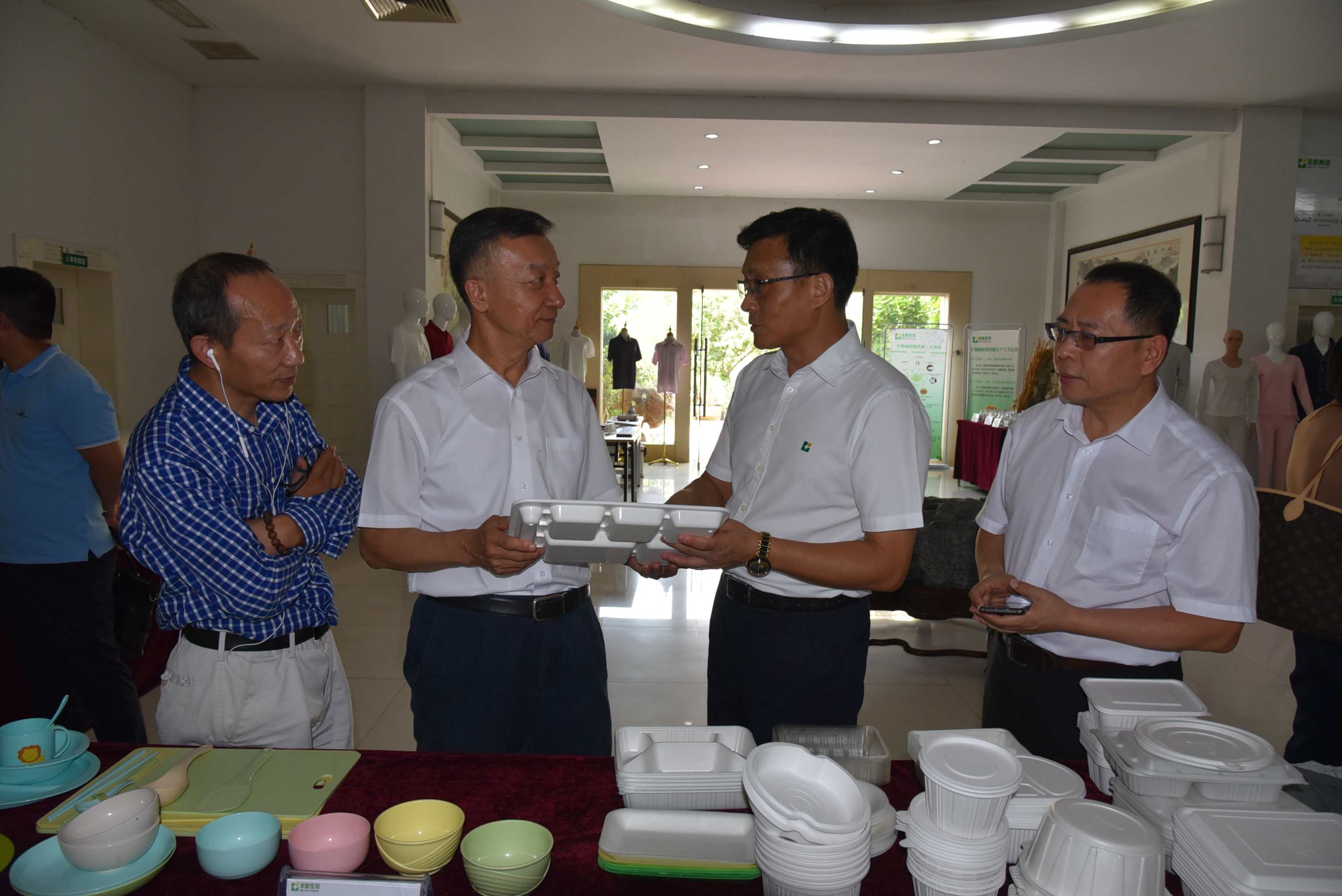 安徽省塑料協會會長韋明、常務秘書長孫有偉、安徽豐原集團 董事長李榮杰、副總經理陳禮平等人的陪同參觀考察了公司產品展示區和企業發展歷程展示墻,聽取公司負責人介紹產品種類、性能、用途等。采用豐原集團可降解塑料生產的一次性餐盒實現減量化,降低成本,利于推廣,基于采用聚乳酸微發泡,具有抗菌功能,可降解塑料生產的衣物具有不長蟲、不返潮、阻燃等優勢。