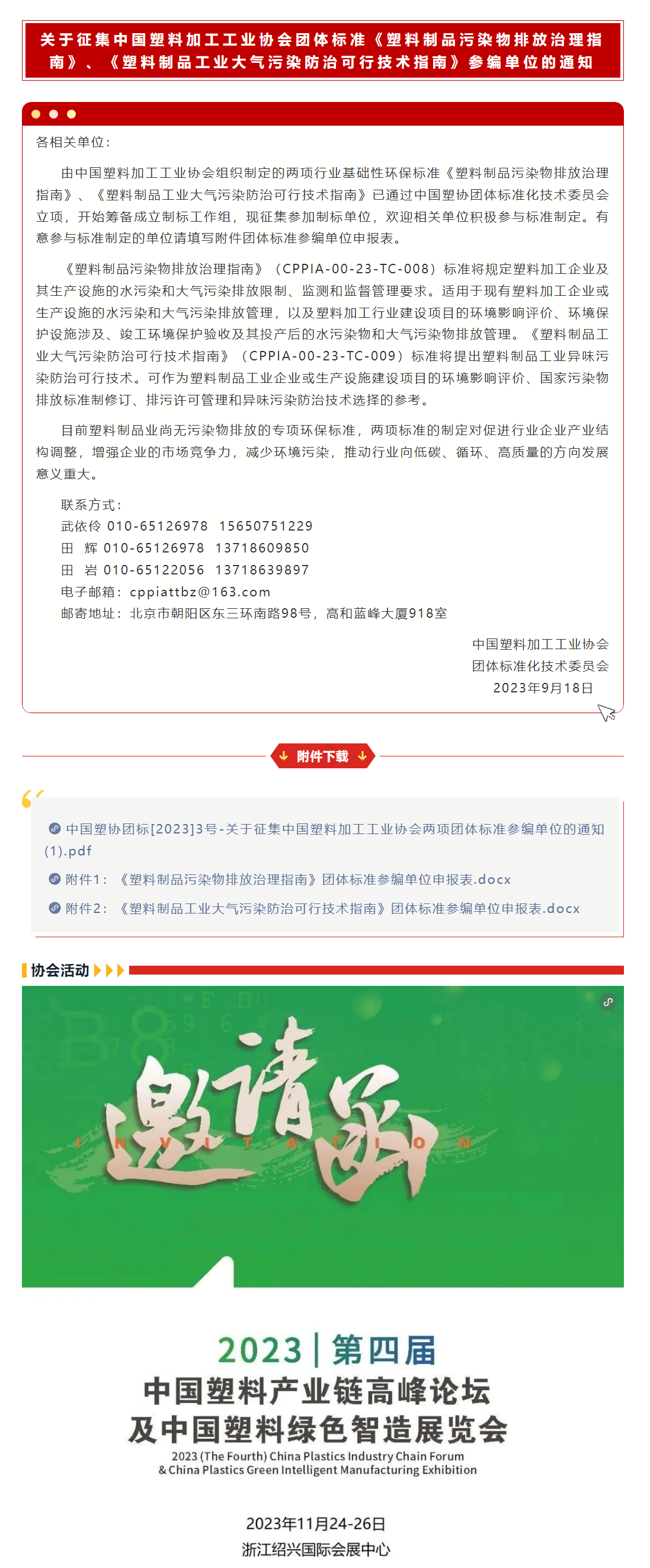 關于征集中國塑料加工工業協會團體標準《塑料制品污染物排放治理指南》、《塑料制品工業大氣污染防治可行技術指南》參編單位的通知