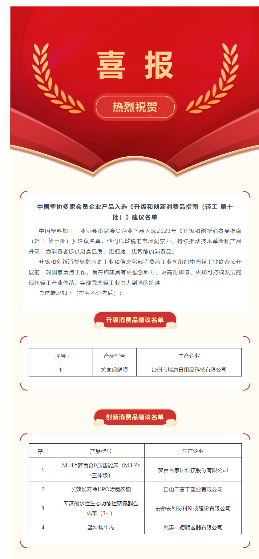 祝賀中國塑協多家會員企業產品入選《升級和創新消費品指南(輕工 第十批)》建議名單!