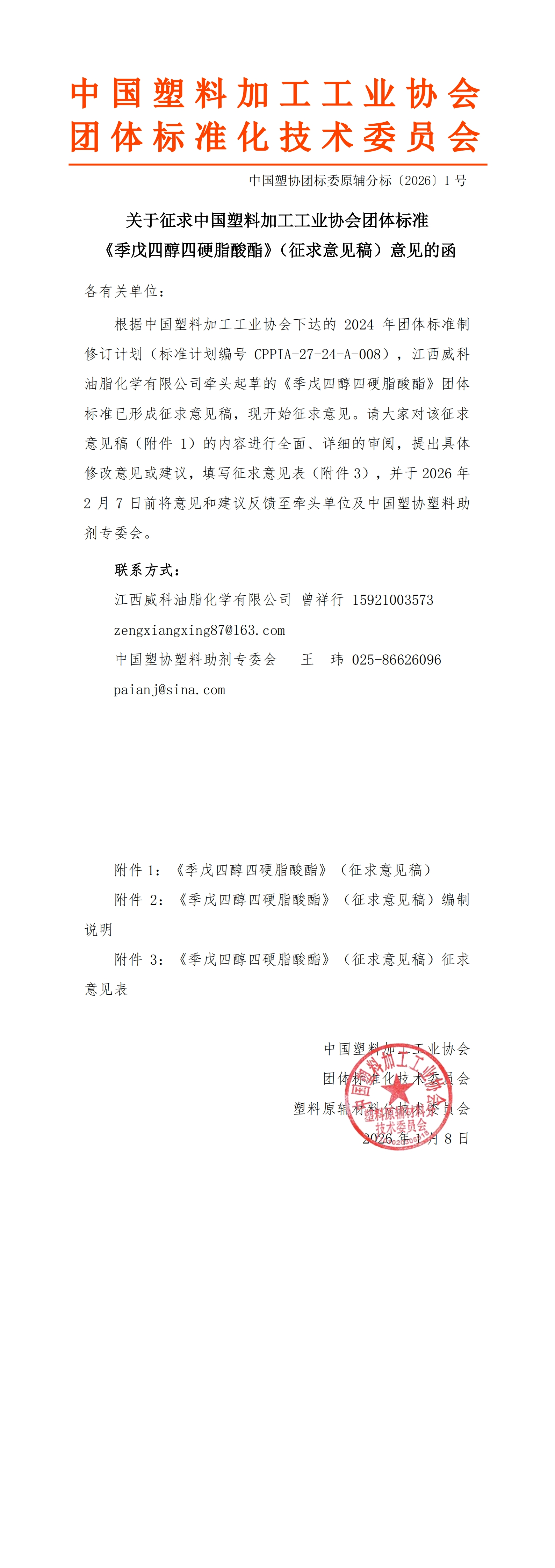 中國塑協團標委原輔分標【2026】1號 關于征求中國塑料加工工業協會團體標準《季戊四醇四硬脂酸酯》(征求意見稿)意見的函.pdf